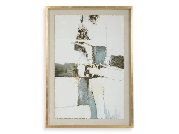 Hand painted on parchment, this elegant watercolor artwork exhibits dark gray-blue, charcoal, and light taupe tones with dimensional gold leaf