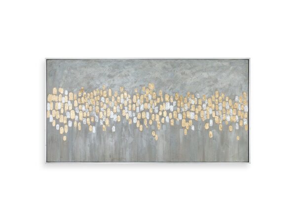Hand painted on a metal sheet, this contemporary artwork features shades of silver and gold leaf, dark brown, and green.