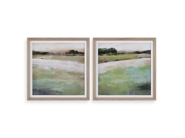 Depicting a serene landscape, this set of two prints uses neutral tones paired with varying green shades from deep emerald