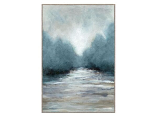 Find Me Here framed canvas is brought to life by a cool-toned palette of blues, grays, browns, and whites, creating