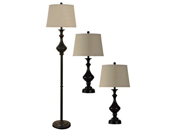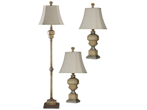 Set Of 3 Lamps 1 Floor 2 Table In Antique Caramel With Natural Line Shades