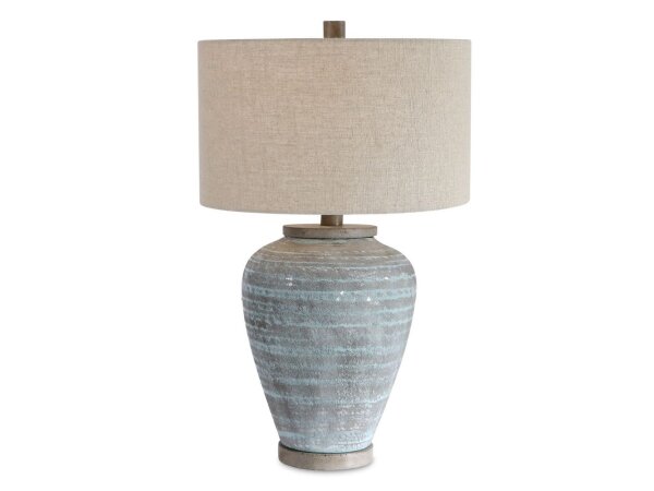 This table lamp lends a touch of old-world, handcrafted style with this ceramic base finished in a distressed slate blue