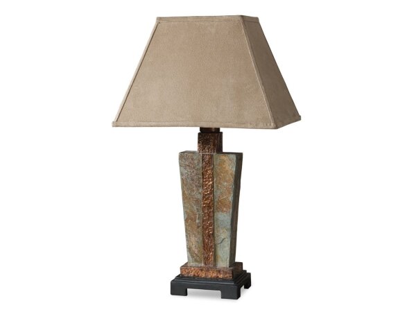 This indoor-outdoor lamp is made of real hand carved slate with hammered copper details. The rectangle bell shade is a