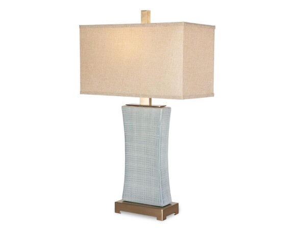 Textured ceramic finished in a pale blue gray glaze accented with plated coffee bronze details. The rectangle hardback shade is