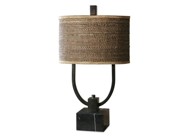 Rustic bronze metal with burnished edges and a black marble foot. The oval drum shade is brown and tan woven
