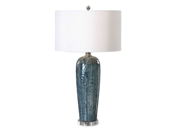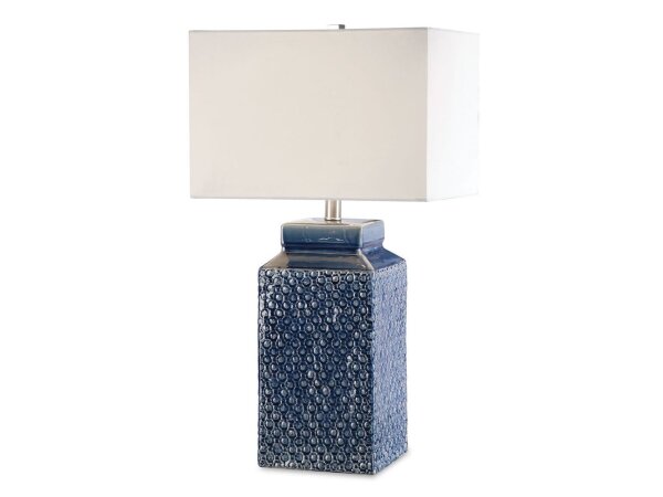 Textured ceramic finished in a fired Sapphire blue glaze accented with brushed nickel plated details. The rectangle hardback shade is