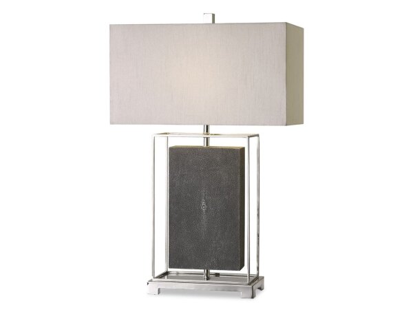 The suspended rectangle base features a rubbed gray faux shagreen texture, surrounded by polished nickel plated details. The rectangle hardback