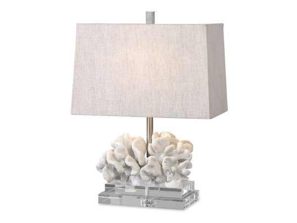 Taupe-ivory coral sculpture paired with a layered thick crystal foot and paired with brushed nickel plated accents. The slightly tapered