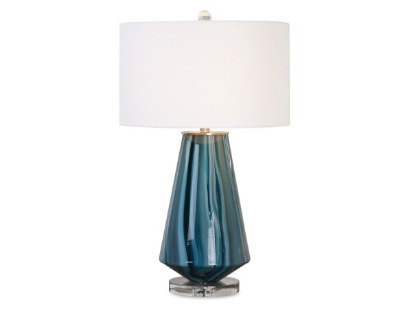 Teal-gray glass base featuring swirls of bold blue-ivory accented with brushed nickel details and a thick crystal foot. The round