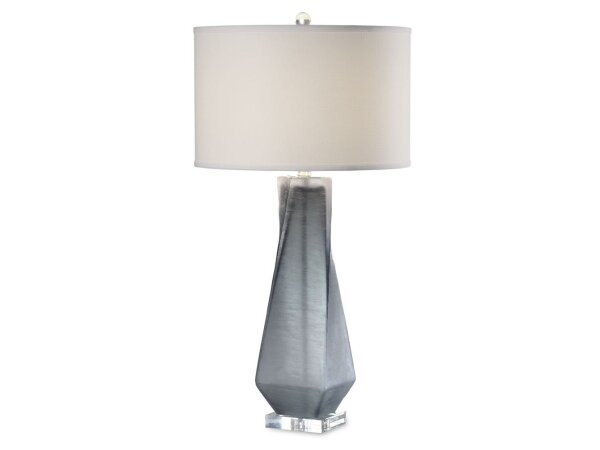 Unpolished, charcoal gray glass, featuring a subtle twist shape, accented with brushed nickel highlights and crystal details. The round hardback