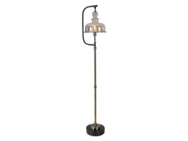 This floor lamp features a delicate design finished in a plated antiqued brushed brass and rusted aged black, featuring a