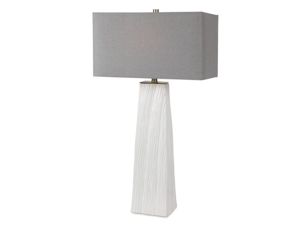 Elegant and versatile, this table lamp features a gloss white ceramic base featuring organic hand carved details and brushed nickel
