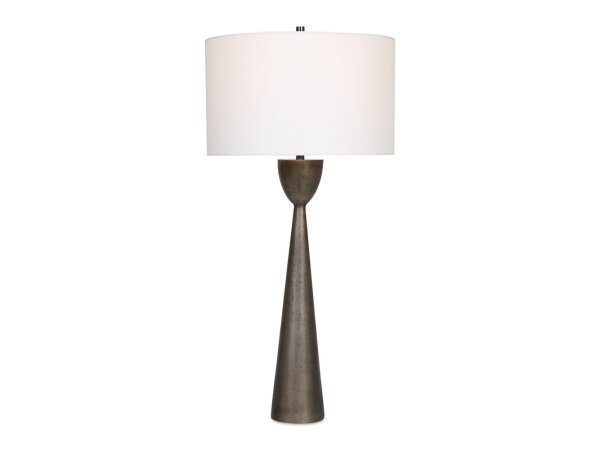 Handcrafted from cast aluminum, this table lamp showcases an old iron look with noticeable indentations and sanding marks, accented with