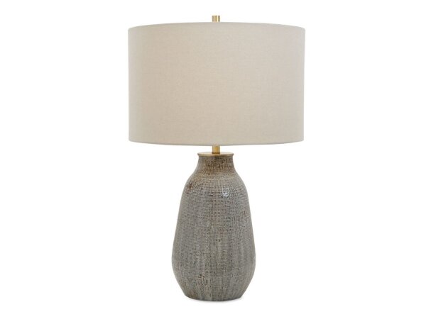 Exhibiting a handcrafted look, this ceramic table lamp features a textured finish reminiscent of woven fabric and is finished in