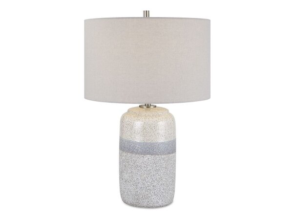 This ceramic table lamp features a heavy mottled white and gray bottom followed by a cool gray center stripe topped
