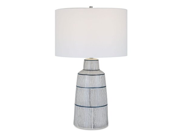 Inspired by the classic nautical stripe knit, this ceramic table lamp sports a satin white glaze with rich navy blue