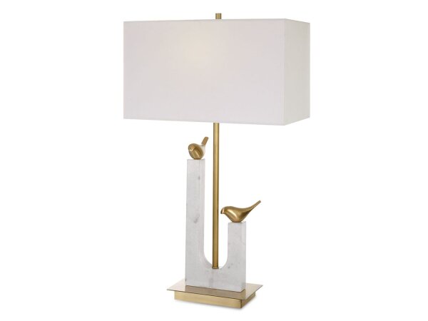 The Songbirds Table Lamp displays two cast brass birds counterpoised on a white marble sling atop a brushed brass plated