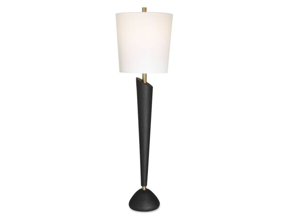 This futuristic buffet lamp design is made of cast black man-made stone with a noticeable pitted surface, paired with antique