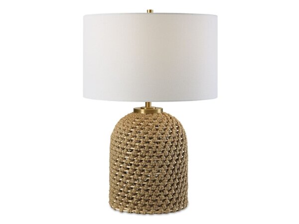 The Kendari Table Lamp features a natural knotted rope wrapped around contrasting light rattan horizontal supports, accented with antique brass