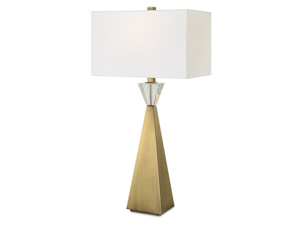 Clean lines define this simplistic design featuring an upscale square column crystal base paired with antique brass plated details. The