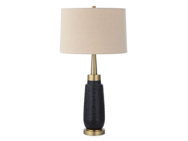 The Remy Table Lamp features a curvy ceramic body finished in a polished, dark navy blue glaze with mottled white
