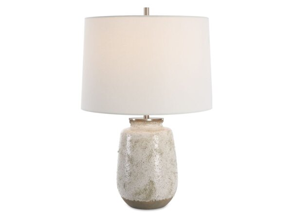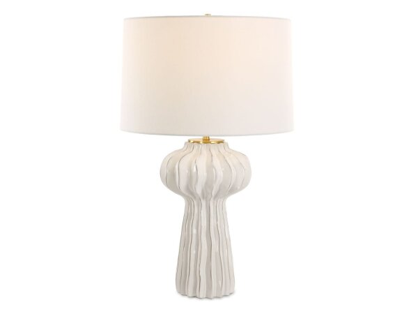 This porcelain table lamp features an organic ridge detailing finished in a glossy off-white glaze with aged distressing. Steel hardware