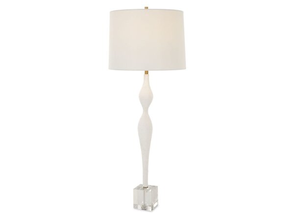 The Helena Table Lamp showcases a slender chalk white ceramic base with feminine curvature and a plaster like texture. A