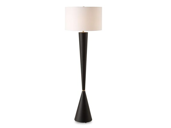 This floor lamp features a tapered iron base finished in a lightly textured aged black complemented by antique brass plated