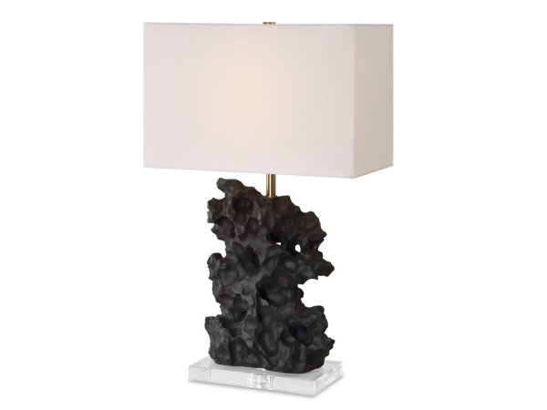 Crafted from a black man-made stone, this unique table lamp replicates a rock sculpture that boasts heavy texture with distinctive