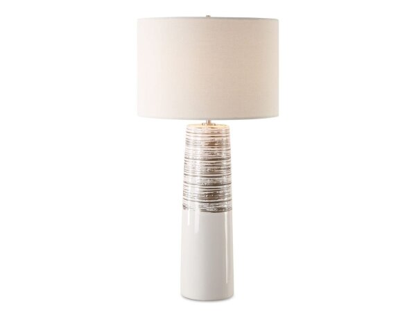 This ceramic table lamp features heavy ribbed texture finished in a heavily distressed ivory glaze with gold leaf undertones, accented