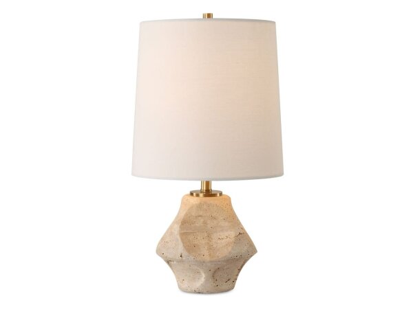 This accent lamp features a scooped out travertine base paired with plated antique brass accents. The slightly tapered round hardback