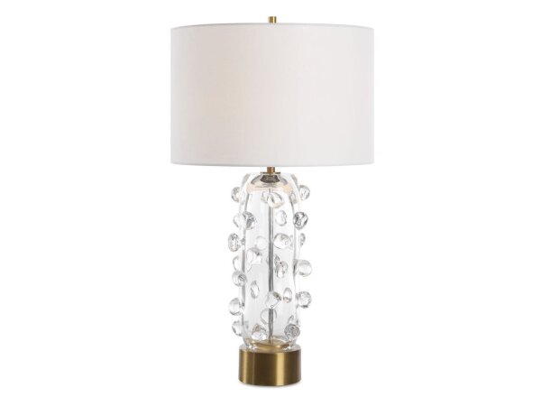 The Aura Table Lamp features a clear glass base adorned with organic glass spheres, set atop a plated brushed brass