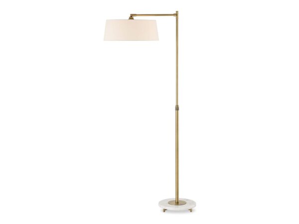 This refined floor lamp is crafted from iron finished in a plated antique brushed brass, attached to a white marble