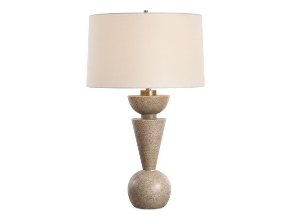 The Cullum Table Lamp showcases a geometric silhouette crafted from sand colored man-made stone, accented with ant brass plated details.