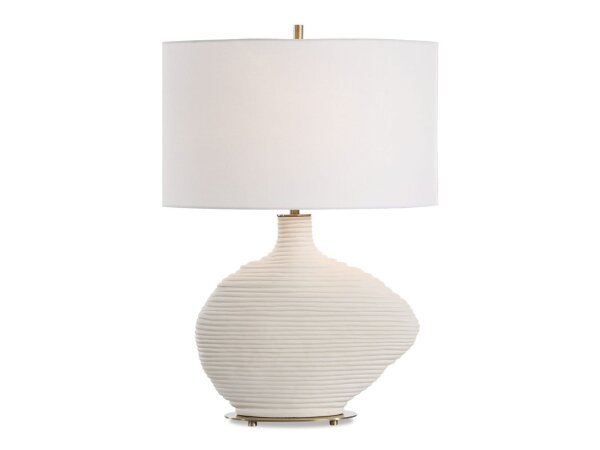 This ceramic table lamp boast a warm white matte finish with horizontal ridge lines, adding a touch of texture and