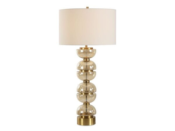 A modern statement piece featuring stacked, light amber glass half-spheres and luxurious brass plated iron accents. The round hardback drum