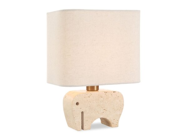 The petite Tusk Accent Lamp features a whimsical elephant sculpture carved out of beige travertine, accented with brass plated details.