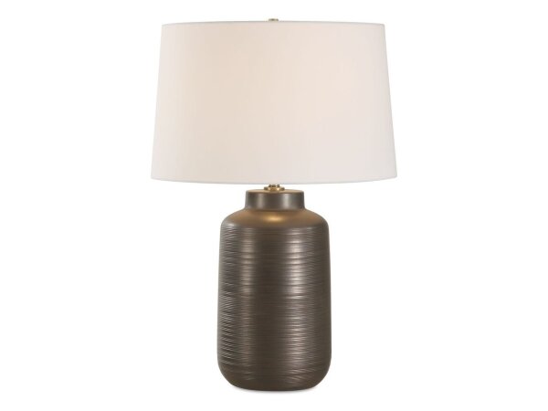The Calderone Table Lamp mixes casual appeal with contemporary styling with a warm, dark bronze porcelain base with distinctive horizontal