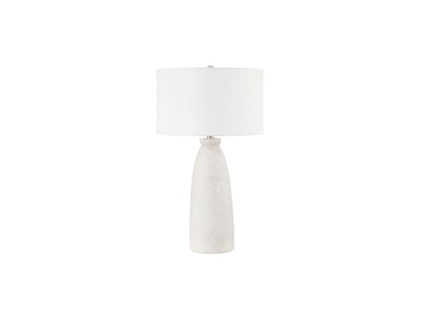 Hand‑cast rice stone and glass column table lamp with an off‑white linen shade and satin nickel fittings for a modern look. Topped with a matching stone finial.