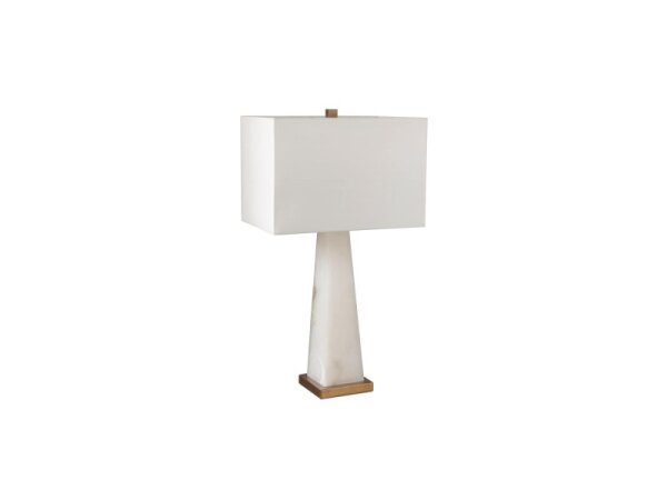 Hand‑cast rice stone and glass table lamp with a scalloped base, paired with a tan linen shade and antique brass fittings for warm, refined lighting. Finished with a matching stone finial.