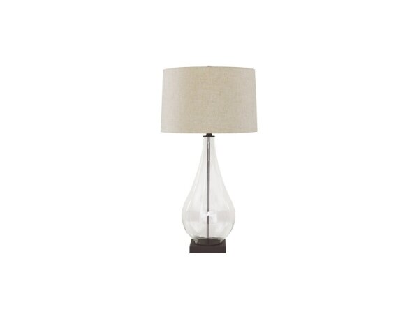 Clear glass cylinder table lamp with warm bronze trim and a beige linen shade; bulb included and on/off switch.