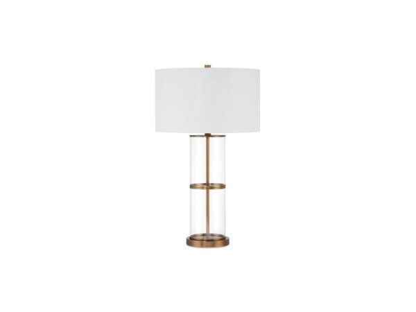 Slender glass cylinder table lamp with aged brass accents and a double beige linen drum shade. Includes bulb; 28.8 in. tall.