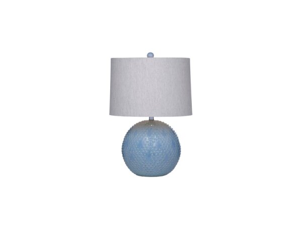 Textured ceramic table lamp in a soft light blue finish that brightens the room; 25 in. high.