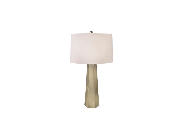 Metal table lamp with a beveled brass-finish base and oatmeal linen shade; bulb included.