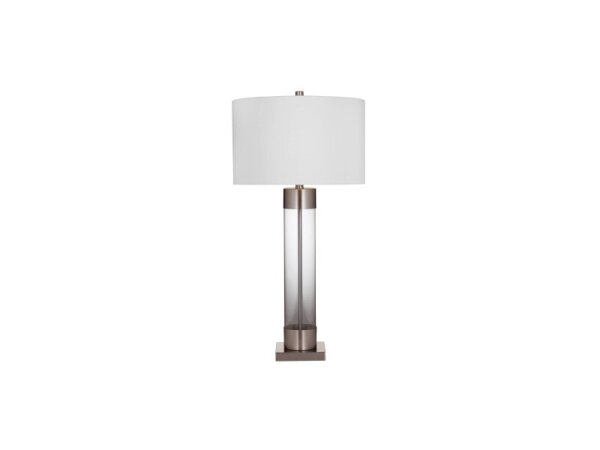 Clear glass cylinder body with brushed nickel accents creates a clean, modern table lamp for stylish accent lighting.