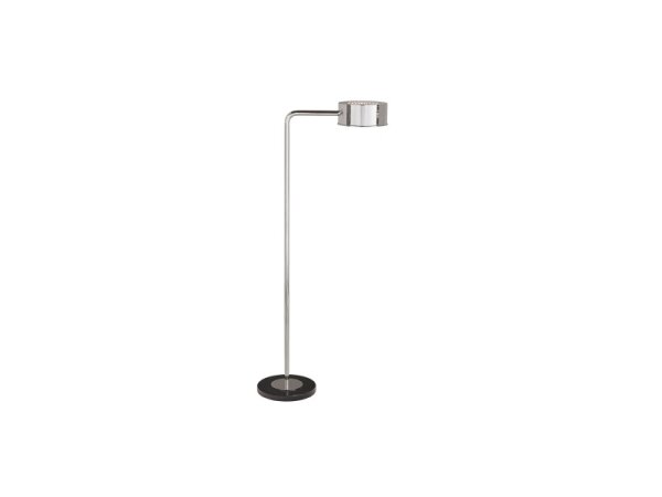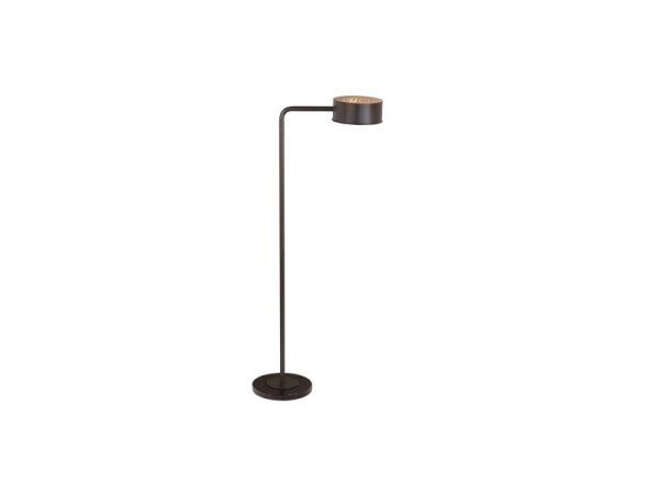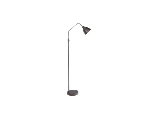 Dark bronze pharmacy-style floor lamp with a flat, perforated hood that casts light above and below, suited for reading. Iron and granite construction; bulb included; 44.5 in. H.