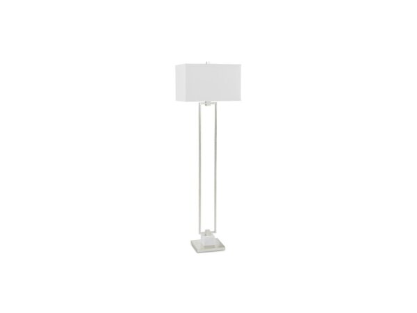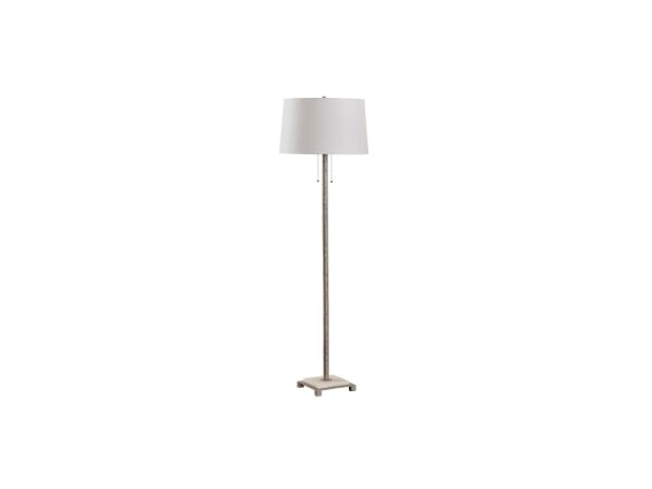 Cylindrical iron floor lamp in a Sand Mercury finish with a tiered alabaster and iron base and a white linen shade. 67 in. tall with pull-chain switch; bulb included.