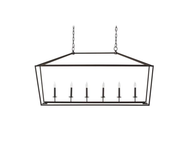 Open-cage pendant light with 6 candelabra lights in an oil-rubbed bronze finish; slope-ceiling compatible and UL Listed for dry locations. Metal construction; 24 in. W x 23 in. H; bulbs not included.