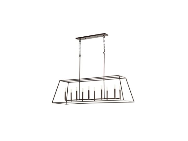 Large cage pendant with 10 candelabra lights in an oil-rubbed bronze finish for larger spaces. Slope-ceiling compatible and UL Listed for dry locations; bulb included.