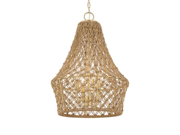 Natural beige rope is knotted and tied by hand in a decorative pattern over a metal frame dressed up with